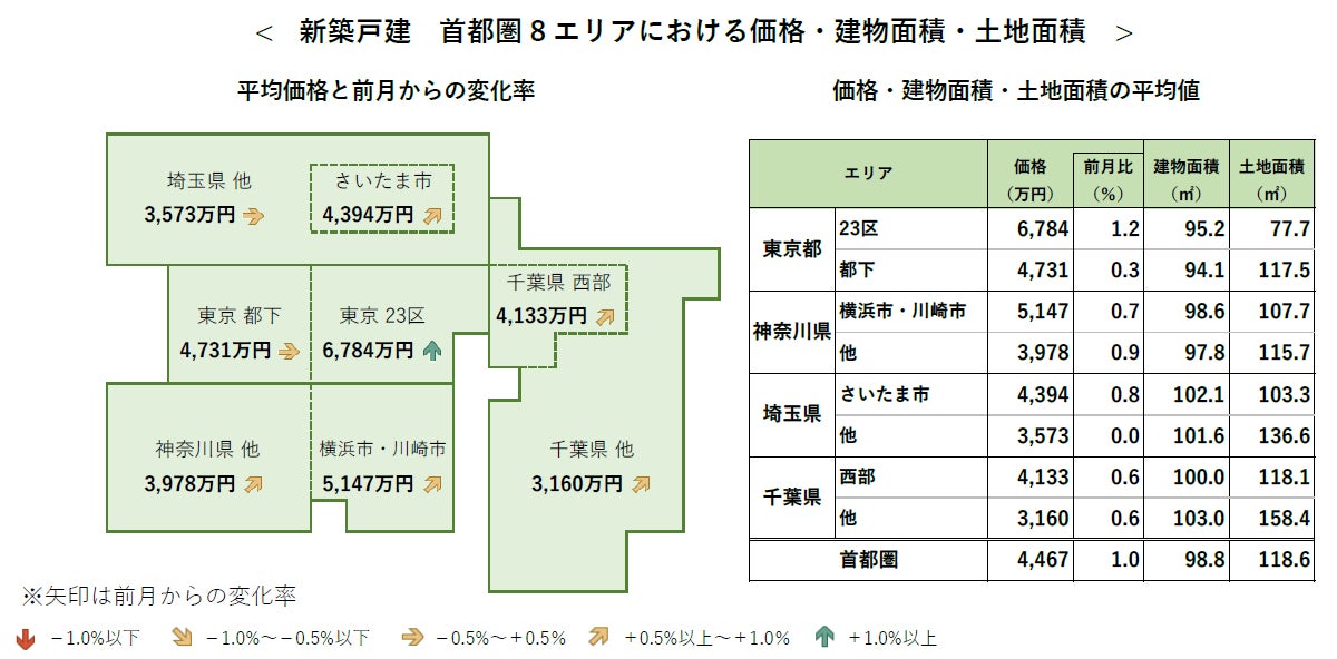 - 首都圏の新築戸建の平均価格は4,467万円で、前月比+1.0%と上昇。