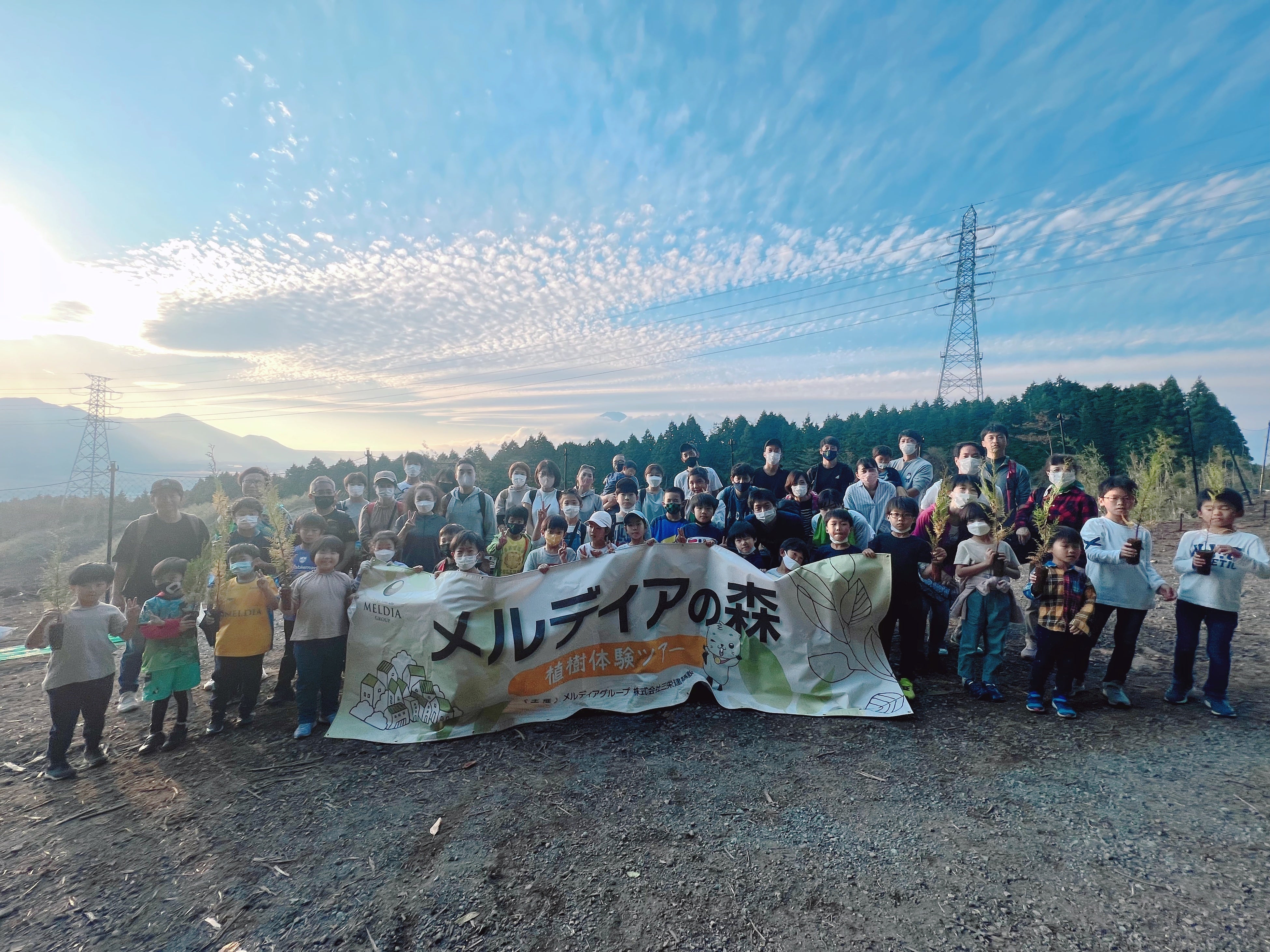 今回のメインイベントである植樹体験のできる「メルディアの森」は、間もなく完成を迎える現在当社で建築中の物件に使用された建築用木材を伐採した跡地でございます。私たちが取り組む循環サイクル(森林資源の循環利用)、「伐る・使う・植える・育てる」の3つ目にあたる植樹を今回ご参加された皆さまと、パートナー企業のイベントスタッフ全員で行いました。