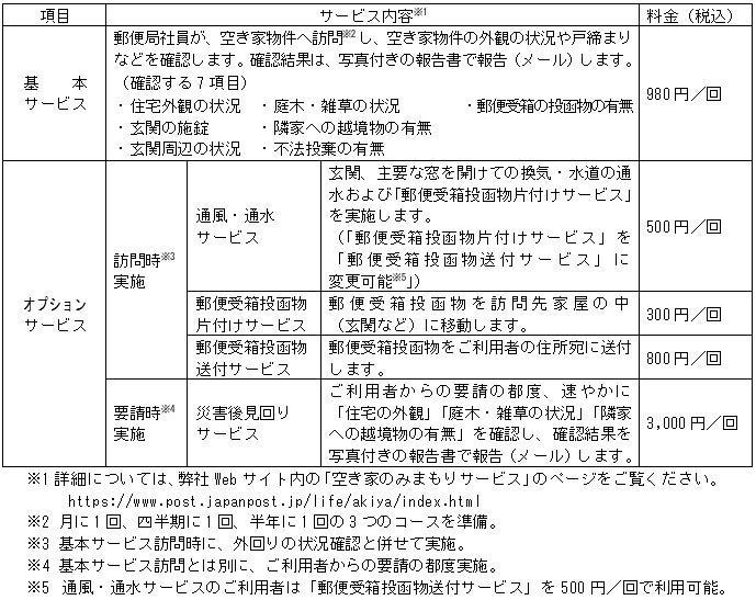 応募方法:弊社Webサイト内の「空き家のみまもりサービス」のページ(https://www.post.japanpost.jp/life/akiya/index.html)から資料請求いただいたお客さまに申込書をお送りいたします。