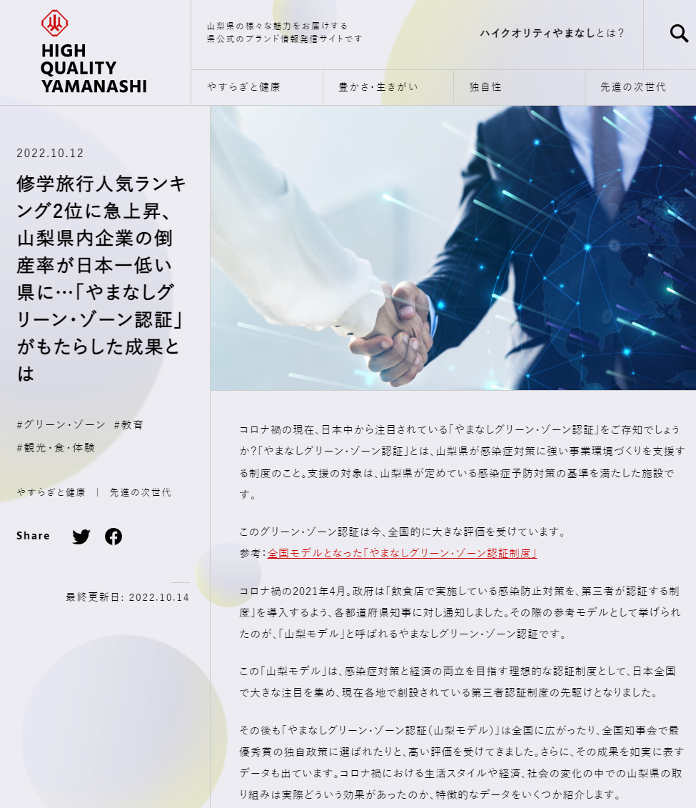 山梨県が感染症対策に強い事業環境づくりを支援する「やまなしグリーン・ゾーン認証」は全国に広がり、全国知事会で最優秀賞の独自政策に選ばれるなど、高い評価を受けてきました。この取組は実際どういう効果をもたらしたのか、特徴的なデータを紹介します。