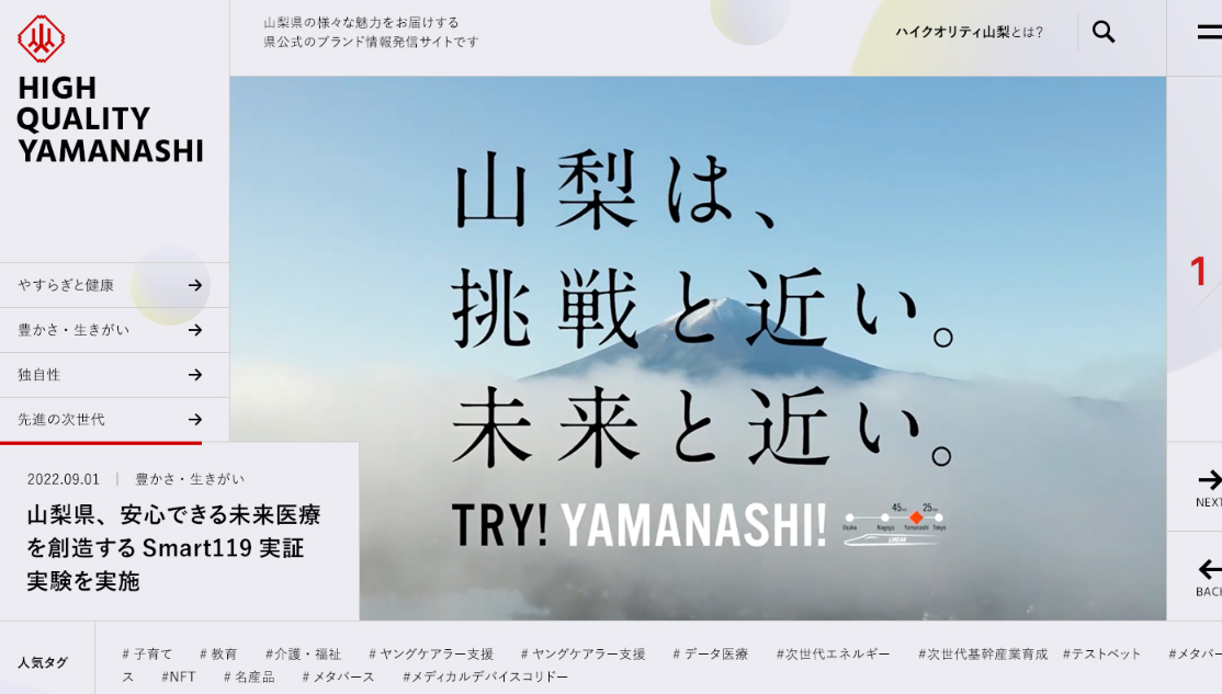 山梨県(知事:長崎幸太郎)は、10月20日、令和4年に運用を開始したブランド情報発信サイト「ハイクオリティやまなし」を大幅リニューアルしました。
