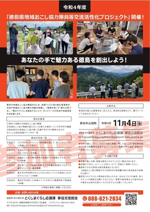 このたび、地域おこし協力隊員をはじめ、地域づくりに取り組む若者等が、交流や最前線の地域協力活動の体験を通じて、「新たな気づき」や「繋がりづくり」を創出するプロジェクトを次のとおり開始することとし、広く参加者を募集しますので、お知らせします。