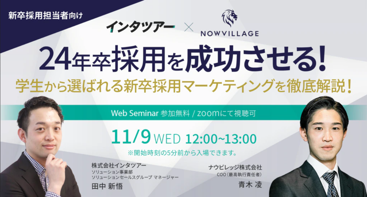 新卒採用向けのリーレション採用プラットフォームを提供する(株)インタツアー(代表:作馬 誠大、本社:東京都港区浜松町)は、2022年11月9日(水)に、新卒採用担当者向けオンラインセミナー『24年卒採用を成功させる!学生から選ばれる新卒採用マーケティングを徹底解説!』を開催いたします。