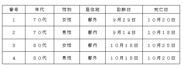 新型コロナウイルスに関連した患者の死亡について business Twitter Facebook はてブ Pocket LINE コピー 2022.10.30 この記事は約1分で読めます。 都内で新型コロナウイルスに感染した方が死亡されましたのでお知らせします。 お亡くなりになった方のご冥福をお祈り申し上げます。 ※ 患者・御家族の人権尊重・個人情報保護に御理解と御配慮をお願いします。
