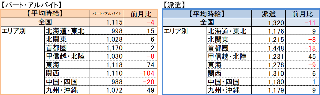 | 【パート・アルバイト】全国・全職種平均時給は1,115円。前月比-4円。前年同月比+50円。 【派遣】全国・全職種平均時給は1,320円。前月比-11円。前年同月比+21円。 【傾向】パート・アルバイトの平均時給は、関西エリアで高時給案件が減少したことを受け、前月に比べやや下降した。しかし、前年同月を9ヶ月連続で上回っており、同条件で比較可能な2016年11月以降で、3番目の高さとなった。派遣の平均時給は2021年6月以降、横ばいの傾向が続いている。 |