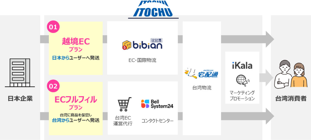 今回のパートナー契約によって、顧客の状況に応じた台湾EC販売を総合的かつ段階的に構築支援するサービスを提供いたします。日本企業の顧客ニーズに合わせ、①越境ECプラン(日本出荷モデル)と、②ECフルフィルプラン(台湾出荷モデル)の2つのプランを提供し、台湾へのEC販売における初期検討から実行までを支援します。