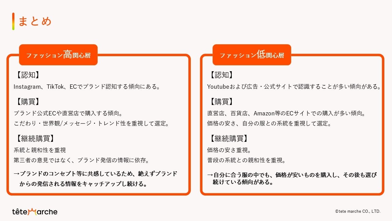 これらを踏まえ川又は「Z世代に選ばれるファッションブランドになるためには、SNSを中心に、共感される情報を積極的に発信し高関心層にアプローチしていくことが重要」だと調査結果をまとめました。
