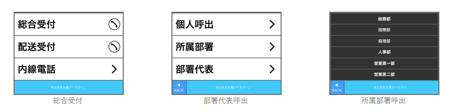 場面や用途に合わせて表示メニューを変更することが可能です。表示内容をカスタマイズすることで、シェアオフィスでの受付として、店舗での一次受付としてなど幅広いシチュエーションに対応することができます。