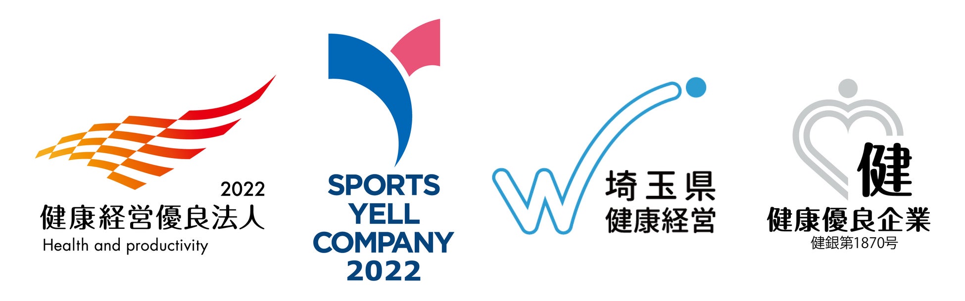 弊社の健康経営への取り組みに対する評価として、経済産業省と日本健康会議が共同で選出する「健康経営優良法人(大規模法人部門)」、スポーツ庁が認定する「スポーツエールカンパニー」、本社所在地である埼玉県が認定する「埼玉県健康経営実践事業所」、および健康保険組合連合会 東京連合会が認定する「健康優良企業「銀の認定」」を取得しています。