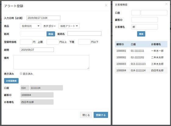本特許技術は現在、各金融機関に利用いただいている提案型営業支援ソリューション「Sales-Cue」に搭載し、金融機関内の顧客情報を一元管理するシステム(CRM)との連携により、「アラート機能」や「サジェスト機能」として提供しています。各企業の決算やコーポレートアクション等のマーケット情報と、顧客金融機関の保有する顧客のポートフォリオや注文履歴等の情報を組み合わせることで、顧客別に関心が高い銘柄等のタイムリーな情報提供を行い、最適な金融商品の提案を促します。