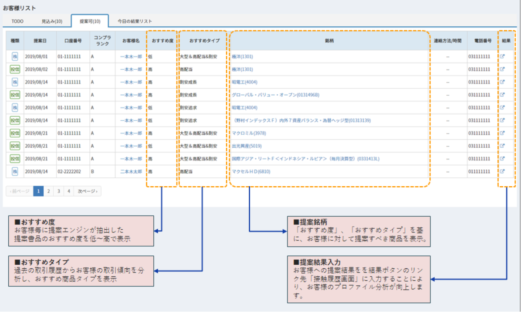 「(本日の)見込み(過去取引無し顧客)・提案可(過去取引あり顧客)リスト」を顧客の属性・売買及び資産状況・営業員との接触頻度等を基にシステムにより選別し、リスト化します。システムが対象顧客の抽出を行うことで、営業員の負担を軽減するだけでなく、取引成立確度を高めます。過去の取引履歴等から関心を持ちそうな潜在顧客を抽出し、取引機会の少なかった顧客に対しても積極的なアプローチを行う事で、より多くの取引機会の創出につながります。