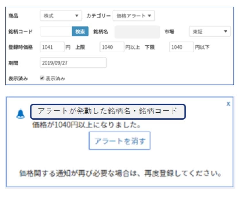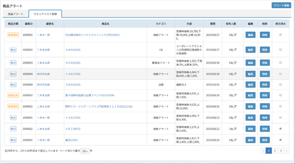 当社のニュース記事の速報性を活かし、顧客別に保有する個別銘柄の価格指定・騰落率・コーポレートアクション・決算発表や、投資信託の価格指定・騰落率・償還日を適時にアラートする機能を活用することで、営業員から顧客への接触タイミングを捉えます。アラートエンジンは、顧客毎に発動したいアラートを個別に設定することが可能で、また365日24時間監視し続けるため、アクティブな取引の提案を可能にします。また、顧客毎に登録しているアラートを一覧画面で確認・編集が可能です。