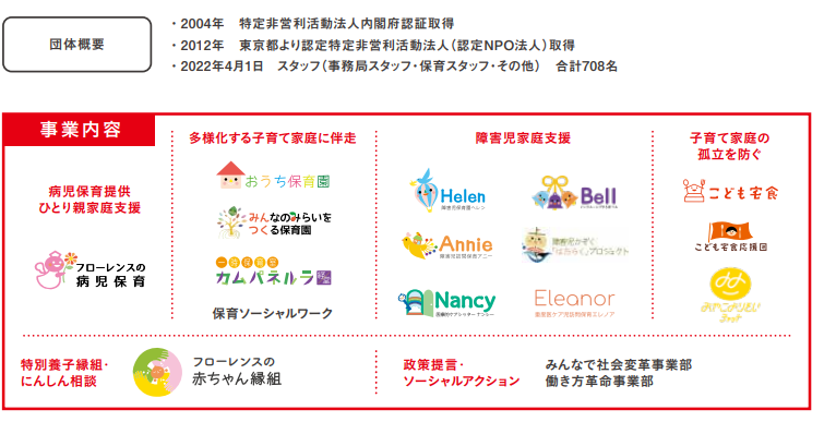フローレンスは、2004年より国内の親子領域の社会課題解決をおこなう特定非営利活動法人です。保育や看護、ソーシャルワークなど現場での福祉支援に関わる専門職スタッフが547名、活動・事業をバックオフィスで支える事務系スタッフ193名、計740名(2022年10月現在正社員雇用人数)の団体で、国内NPO団体において最大規模の組織です。