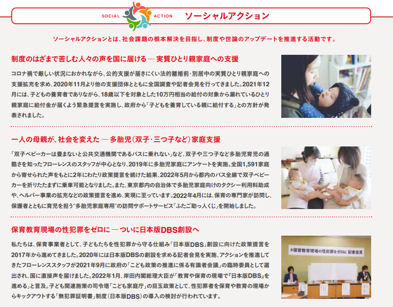 フローレンスは、「親子の笑顔をさまたげる社会問題を解決する」ことをミッションとし、「みんなで子どもたちを抱きしめ、子育てとともに何でも挑戦でき、いろんな家族の笑顔があふれる社会」の実現を目指して社会変革に取り組んできました。