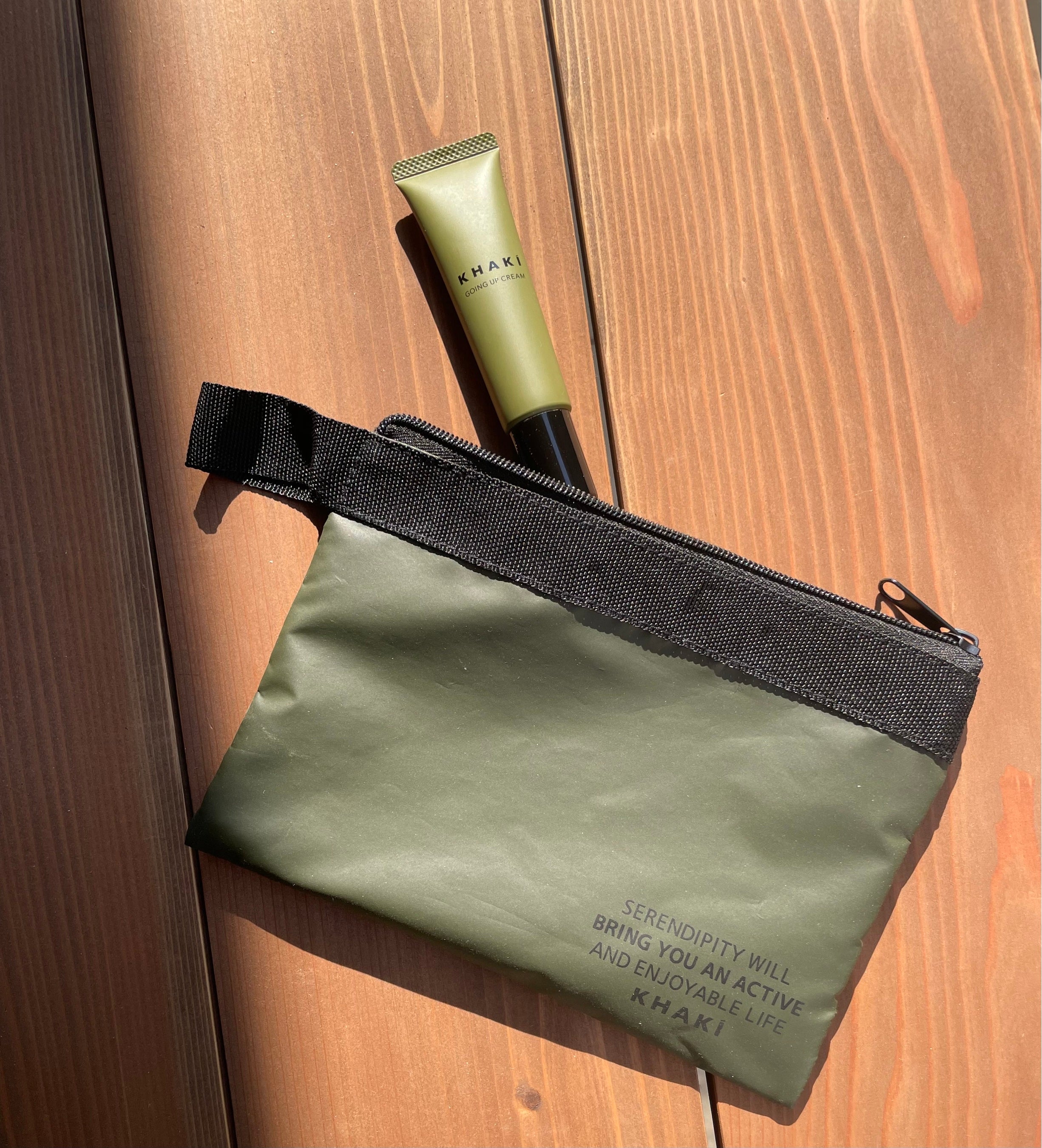 KHAKI GOING UP CREAMは小さくて軽いので持ち運びしやすく、外出先で顔が疲れていると感じた時にさっと取り出してひと塗りするのにも抵抗ない、落ち着いたデザインです。