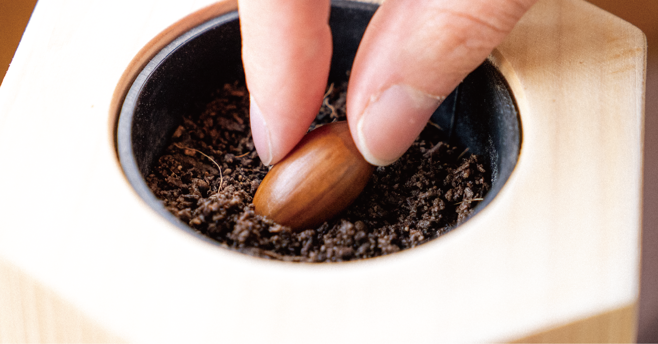 戻り苗は、誰もが山づくりに参加できる新しい観葉植物です。どんぐりから苗木を育てるセットになっており、購入者の元で育った苗木は、当社が引き取り山へ植林します。育てる期間は約2年間。その後、苗木が植林される和歌山県の木材を使用した製品を購入することも可能です。