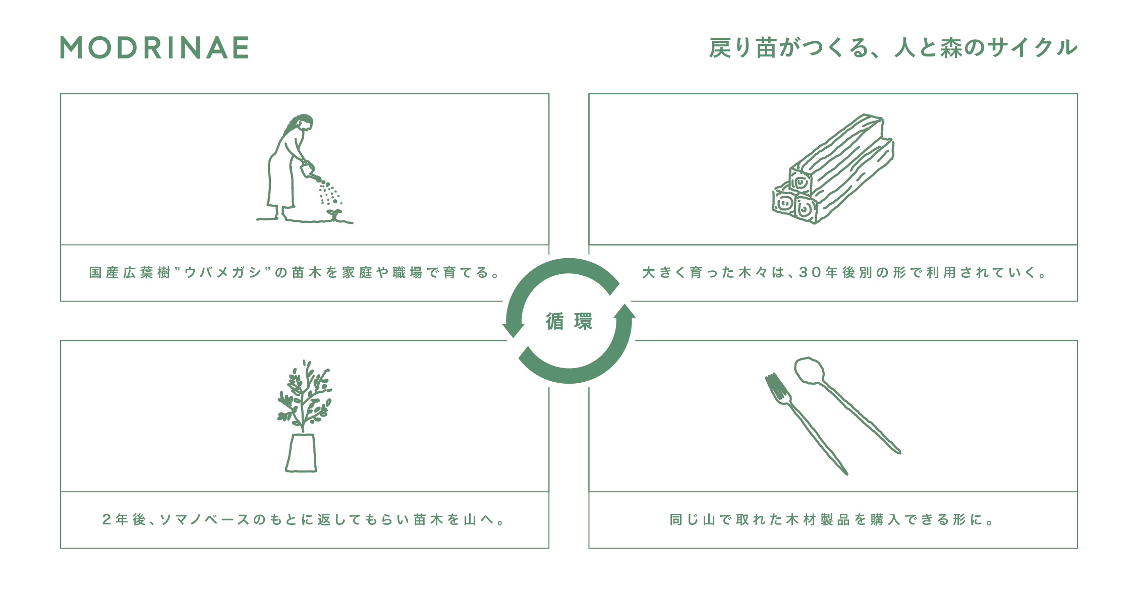 戻り苗は、森林や森林産業に対する意識を「消費者」から「当事者」に変えるプロダクトであり、サービスです。私たちは、木材製品のみではなく、木を育てるという体験や、森林や森林産業関係者との温もりのある関係性をご提供します。