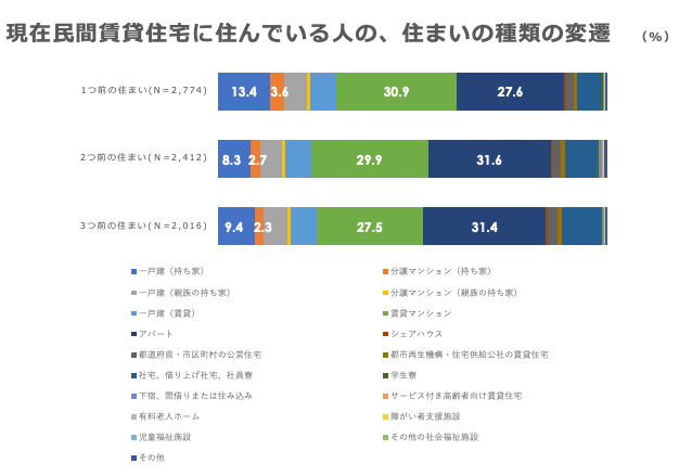 現在、民間の賃貸住宅に居住されている方の1つ前の住宅形態をみると、「賃貸マンション」(30.9%)、「アパート」(27.6%)などの賃貸住宅から賃貸住宅への住み替えが多い中、「一戸建(持ち家)」(13.4%)、「分譲マンション(持ち家)」(3.6%)などの持ち家から賃貸住宅への住み替えが17.0%もあることが分かります。これは、一戸建の持ち家が、住宅すごろくの共通のゴールではなくなり、ライフスタイルに合わせて、持ち家⇔賃貸住宅の住み替えが行われていることを意味しています。