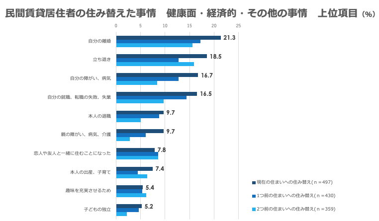 これらのネガティブな理由の内訳は、1番が「自分の離婚」(21.3%)、2番が「立ち退き」(18.5%)、3番が「自分の障がい、病気」(16.7%)となっています。