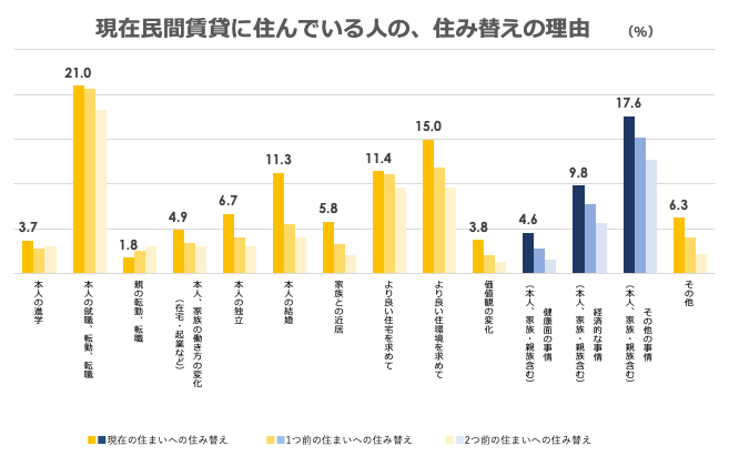 民間賃貸住宅の住み替え理由をみると、「本人の就職、転勤、転職」(21.0%)、「よりよい住環境を求めて」(15.0%)などポジティブな理由が、上位に挙がっていますが、一方で、「その他の事情」(17.6%)や「経済的な事情」(9.8%)といったネガティブな理由も意外と高いことがわかります。