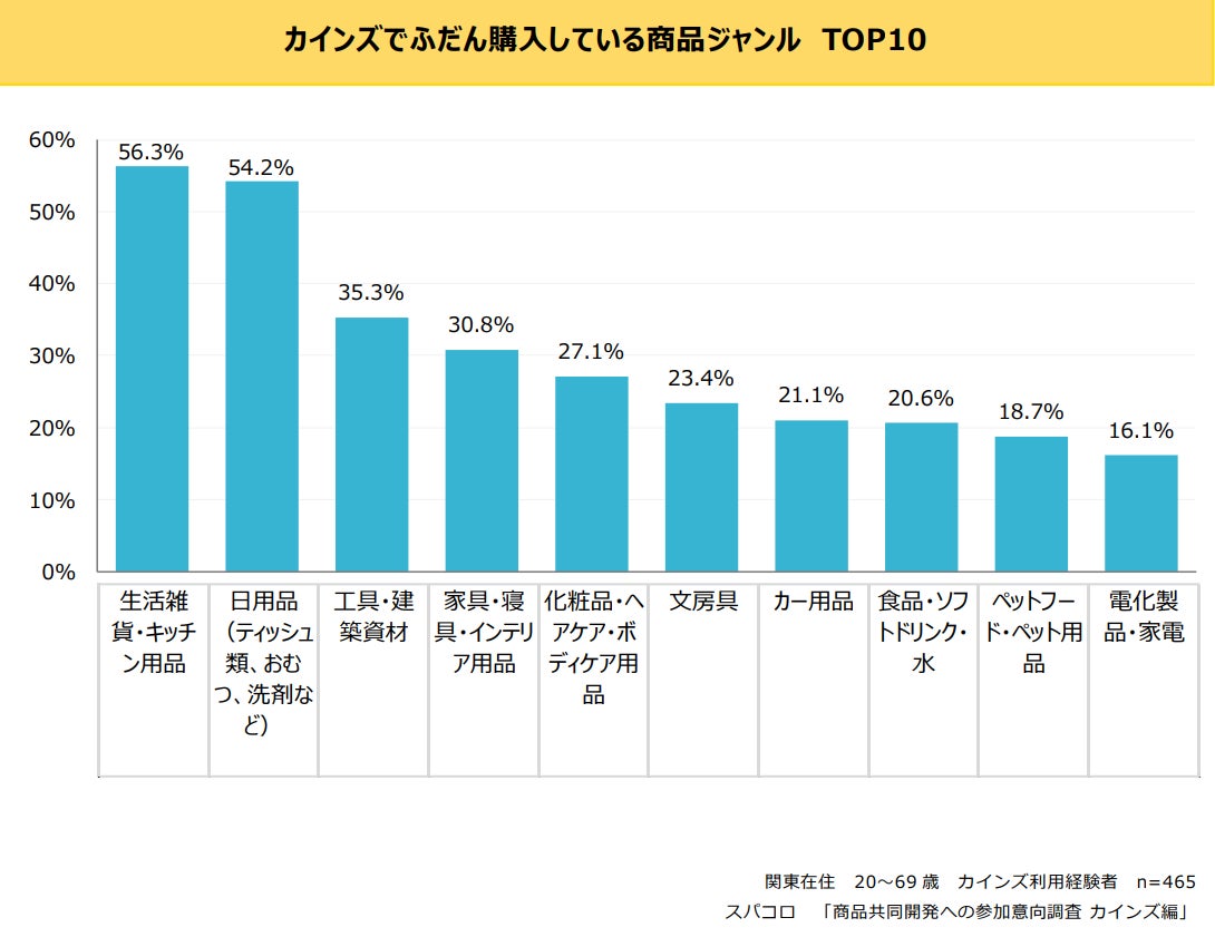 実際、カインズユーザーはカインズでどんなものを購入しているのでしょうか。購入されているものは、上位から「生活雑貨·キッチン用品」(56.3%)、「日用品」(54.2%)、「工具・建築資材」(35.3%)が続いています。