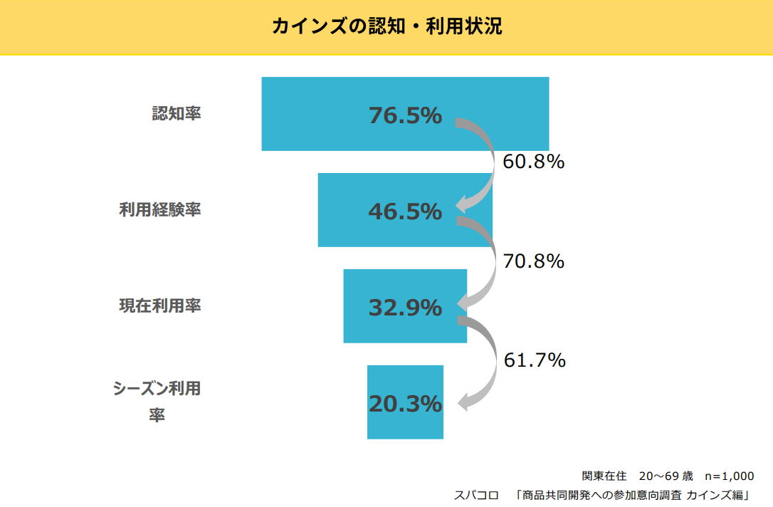 顧客のどれくらいの人が商品開発に参加したいかをみていく前に実際、どれくらいの人がカインズを利用しているのかみていきます。関東在住の20~69歳の1,000人に聞いたカインズ認知・利用状況では認知率76.5%、利用経験率46.5%、現在利用率32.9%、シーズン利用率20.3%という結果に。関東の5人に1人はシーズンに1回以上カインズを利用していることが伺えます。