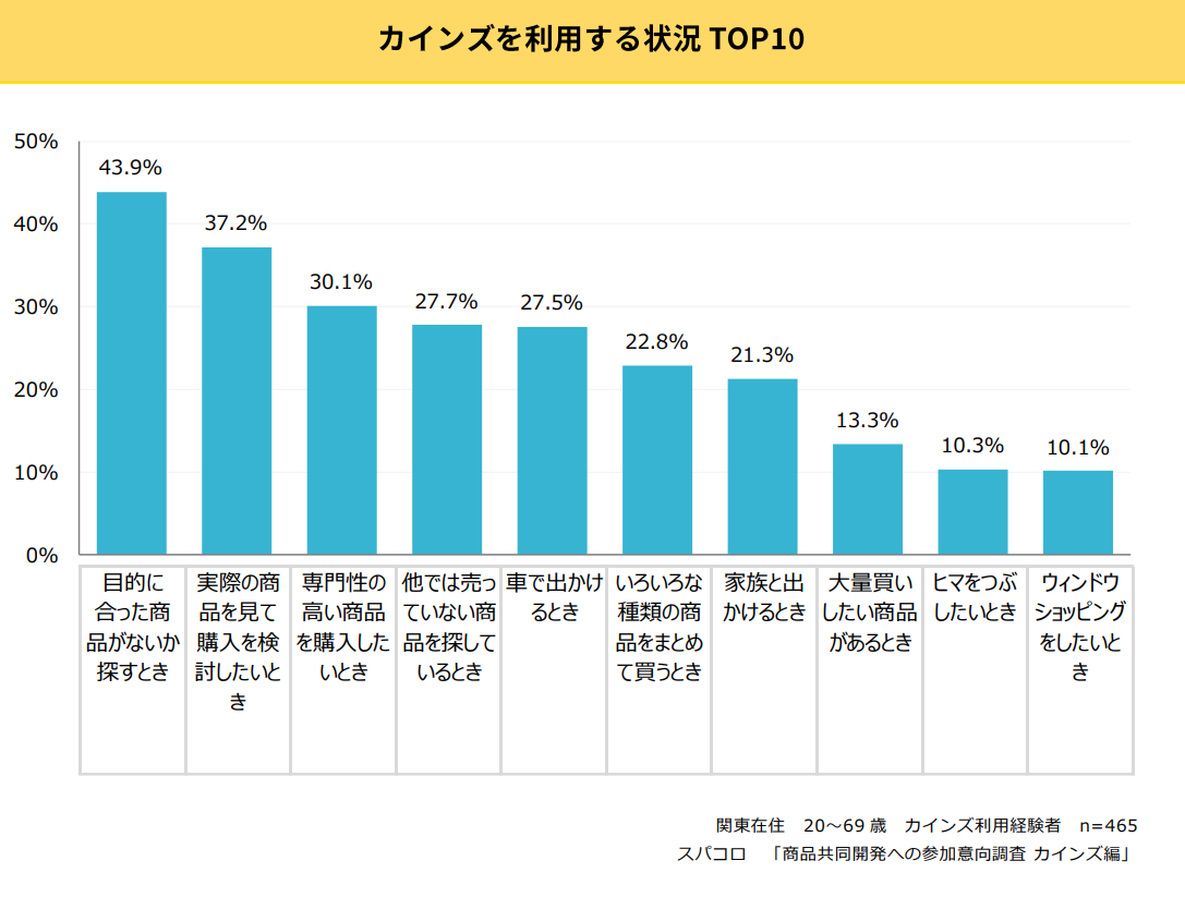 カインズユーザーはどんな時にカインズにいくのでしょうか?カインズを利用する状況は、上位から「目的に合った商品がないか探すとき」(43.9%)、「実際の商品を見て商品を検討したいとき」(37.2%)、「専門性の高い商品を購入したいとき」(30.1%)が続いています。