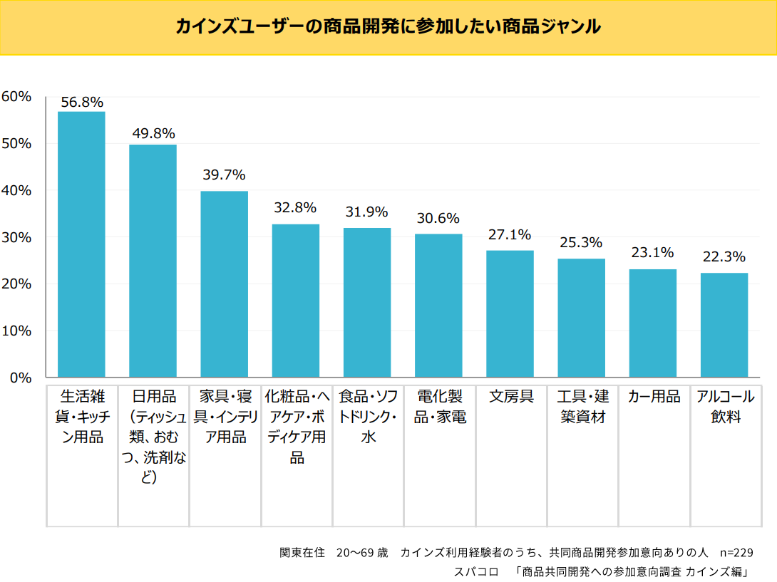 近年では、自社のプラットフォームや実際の商品開発の現場で顧客との接点を持ち商品の共同開発を行う企業があることを耳にすることが増えてきました。今回は『実際に企業から商品共同開発提案があったらどれくらいの人が参加したいと考えているのか』を、ホームセンター大手のカインズを例に挙げ調査してみました。