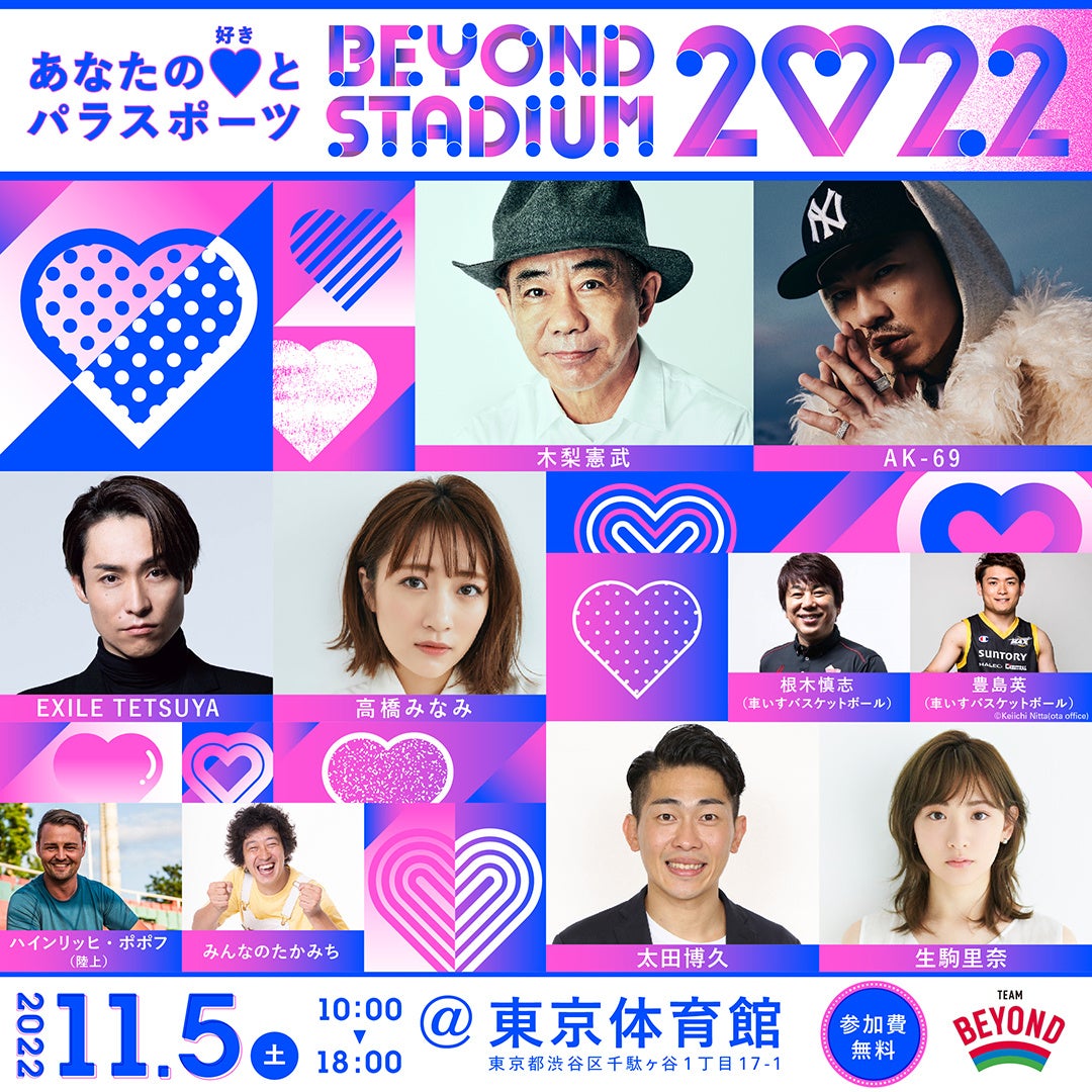 会場では、木梨憲武さんとAK-69さんが共同制作したTEAM BEYOND応援ソングの完成披露LIVEや、司会進行のEXILE TETSUYAさん、高橋みなみさん、ジャングルポケット太田さん、水溜りボンドさんといった著名なゲスト陣のほか、メダリストを含む多くのパラアスリートが集結し、交流が楽しめるコンテンツが盛りだくさんです!