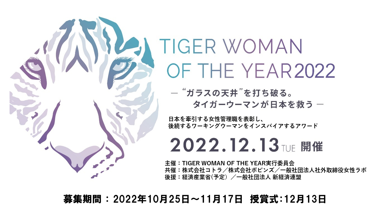 日本企業における女性マネージメント層の活躍を推進すべく啓発活動を行う「TIGER WOMAN OF THE YEAR実行委員会」(本部:東京都港区・実行委員長 大西利佳子)は、人的資本経営元年とも称される2022年、旧来式のビジネスや組織に革新をもたらす女性リーダーを公募し、表彰するアワード「TIGER WOMAN OF THE YEAR」(共催:株式会社コトラ/株式会社ポピンズ/一般社団法人女性社外取締役ラボ、後援:経済産業省(予定)、一般社団法人 新経済連盟)を創設しました。https://tigerwoman.net/
