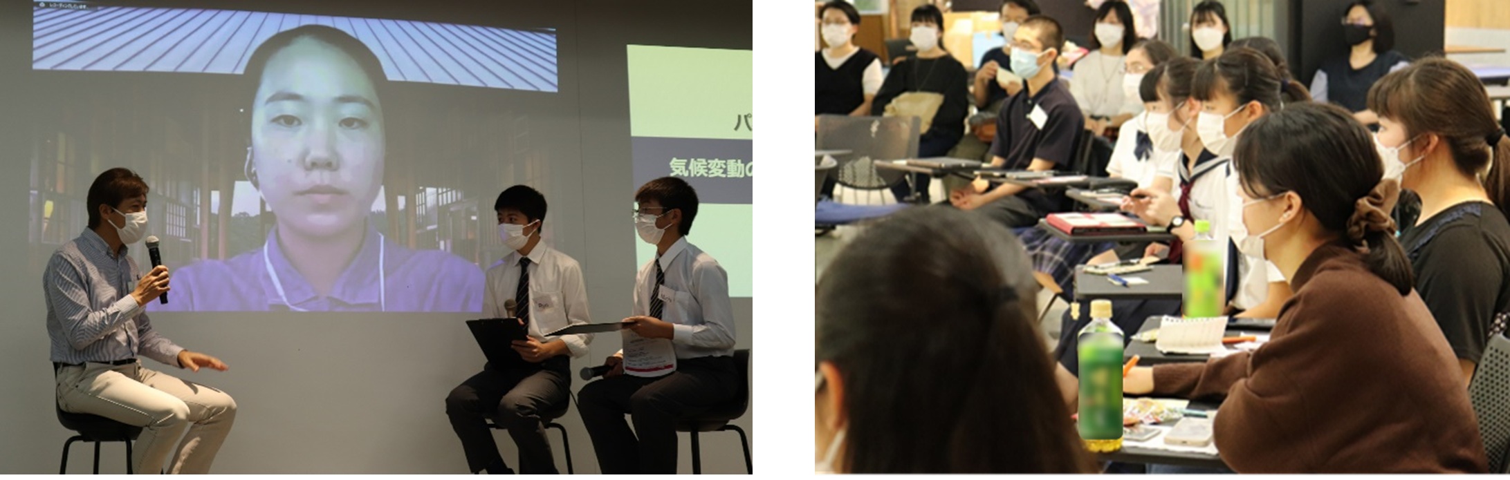 9月25日(日)の発表会では、まず、全5回のワークショップの学びを振り返った後、各チームによる制作動画の発表とプレゼンテーションを行いました。次に、江守正多先生と大塚桃奈氏によるパネルディスカッションを行い、「より多くの人に気候変動に関心を持ってもらうにはどうすれば良いか」などについて対談をしました。