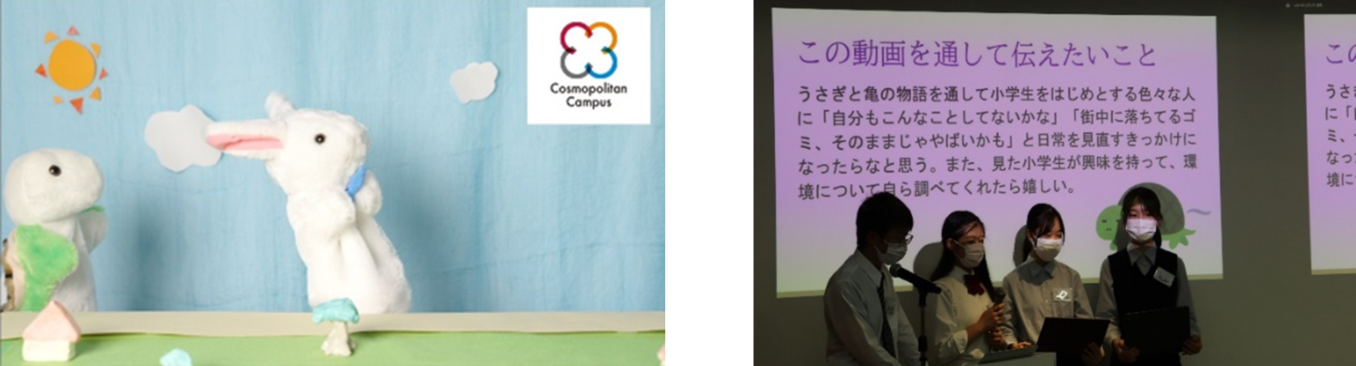 発表内容:地球環境について、この動画を見た人に共感してもらえるよう、生活に身近な「ゴミの分別・ポイ捨て問題」を「うさぎとかめ」の話にのせて制作した。生活の中で「自分もこんなことしていないかな」「街中に落ちているゴミはこのままだとまずいかも」と日常を見直すきっかけになって欲しい、また、地球環境について興味を持って自ら調べるきっかけとなったら嬉しい。