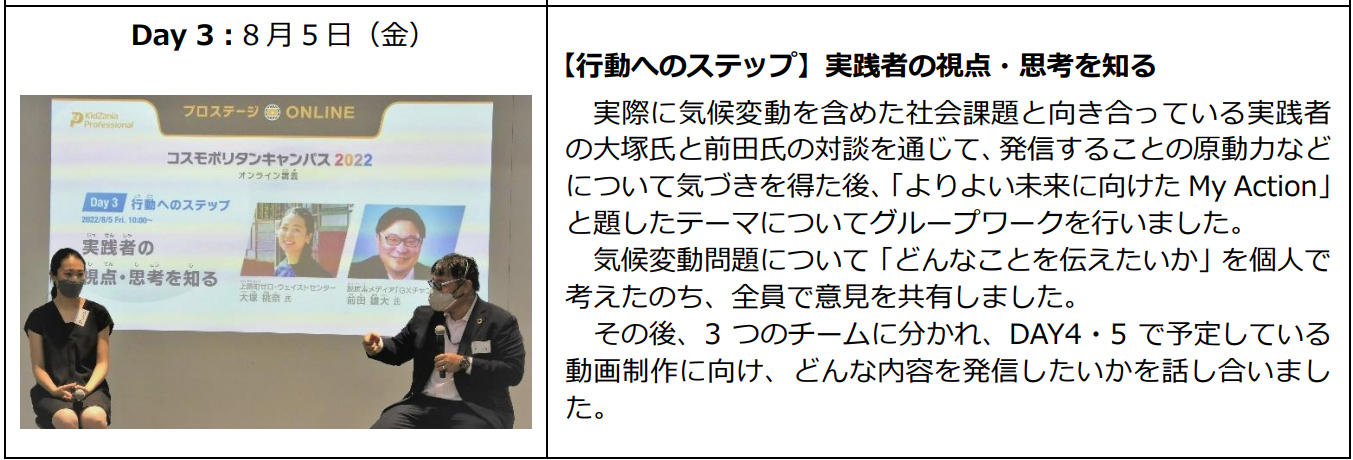 こどもの職業・社会体験施設「キッザニア」の企画・運営を行うKCJ GROUP 株式会社(本店:東京都千代田区、代表取締役社長:圓谷 道成)は、2022年8月3日(水)~5日(金)・8日(月)・9日(火)の全5回、中学生を対象にしたSDGsワークショップ、コスモポリタンキャンパス 2022「気候変動のシナリオを変えよう!-Change Makers PJ-」を開講しました。