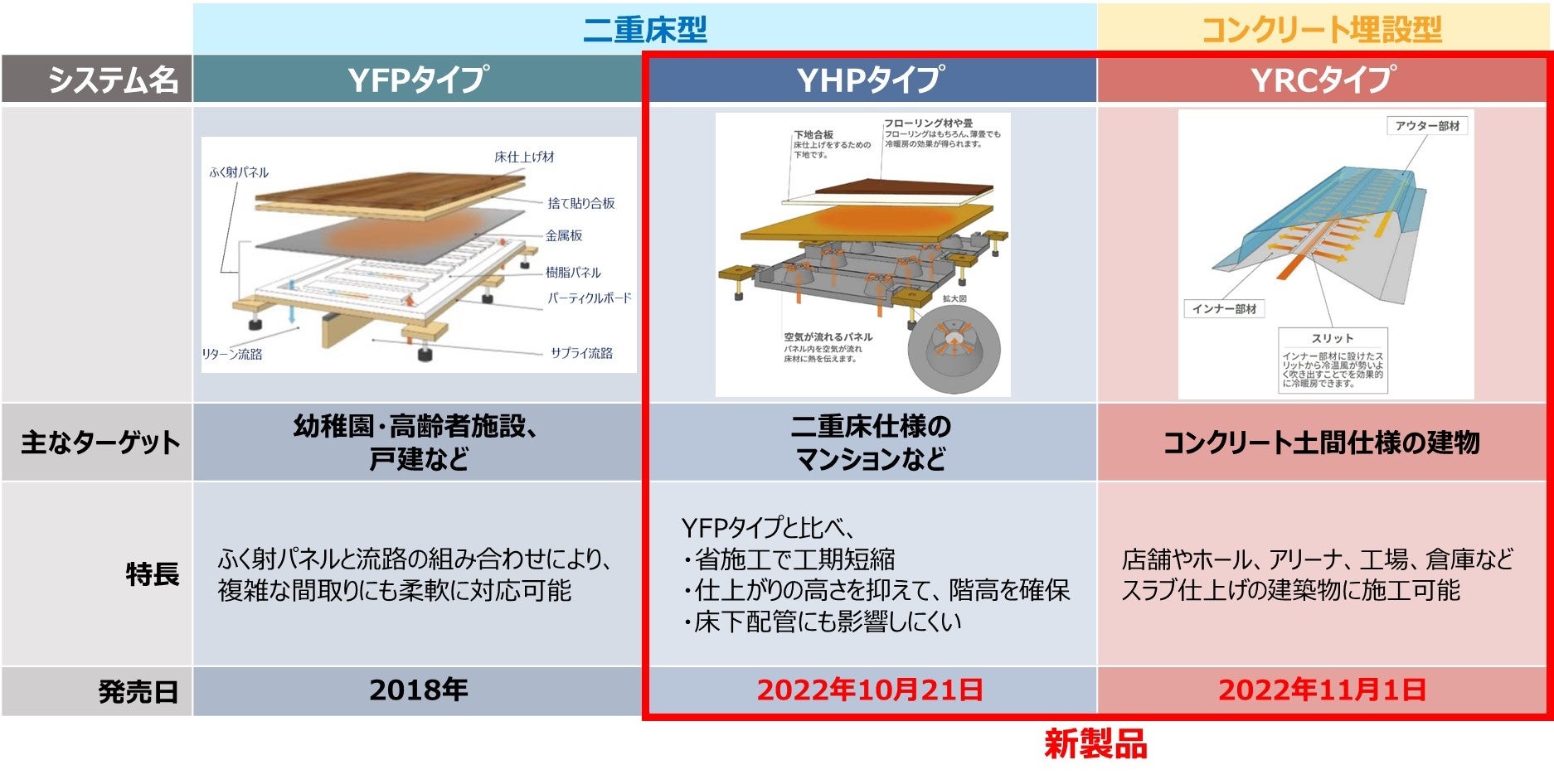 この度のバリエーション拡充もその一環です。これまで「ユカリラ」は、中小規模施設や戸建住宅向けのYFPタイプのみのご提案でしたが、今回のタイプ追加により、幅広い市場への訴求が可能となりました。先月より提案を開始した『ユカリラYHPタイプ』は、既存のYFPタイプと比べて施工性に優れ、短工期対応のご要望が多いマンションなどにおすすめです。また、11月1日提案開始の『ユカリラYRCタイプ』は、YFPタイプでは非対応だったコンクリート土間仕様の建物に施工でき、倉庫や工場、アリーナ施設などの大規模空間でもお使いいただけます。なお既存のYFPタイプは、複雑な間取りの空間に対応できる製品として販売を続け、今後「ユカリラ」は特性の異なる全3タイプをラインアップし、提案活動を展開してまいります。