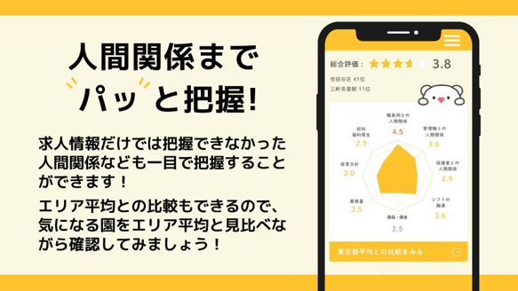 求人情報や面接では得られない、「人間関係」などに関する保育園の口コミや評判を掲載するサイトです。保育士が知りたい「リアル」な情報を可視化することで、早期離職や入社後のミスマッチの防止を目的としています。