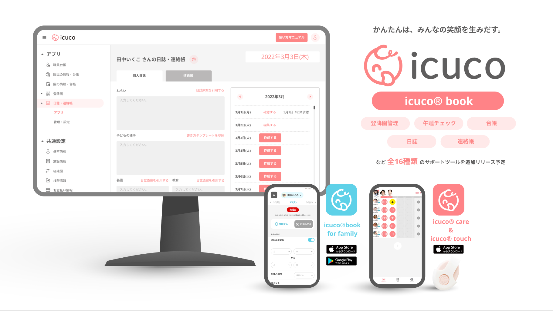 また、icuco®︎touch & careとシステム連携可能な icuco®︎book もプロトタイプが導入園で稼働中です。
