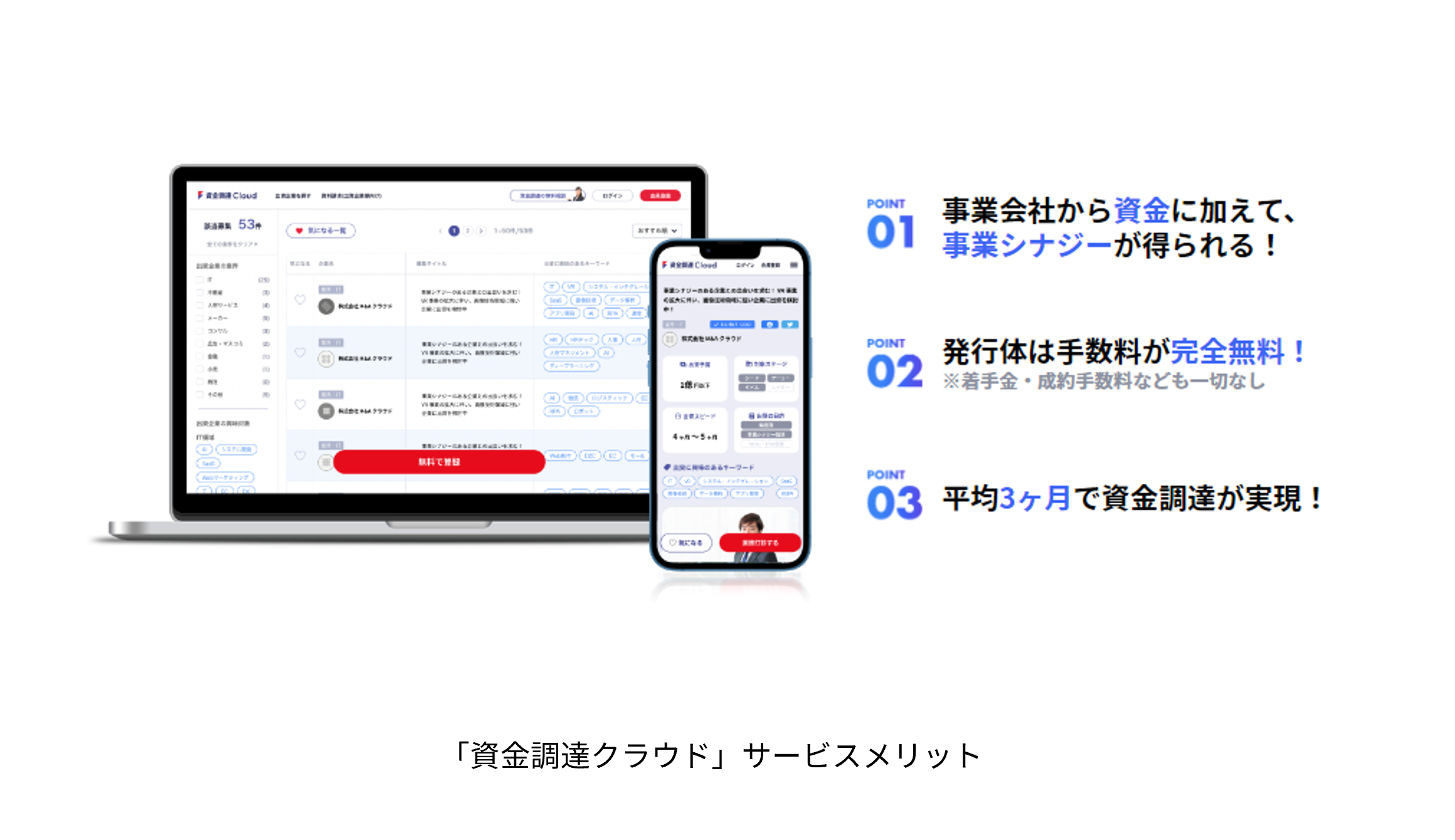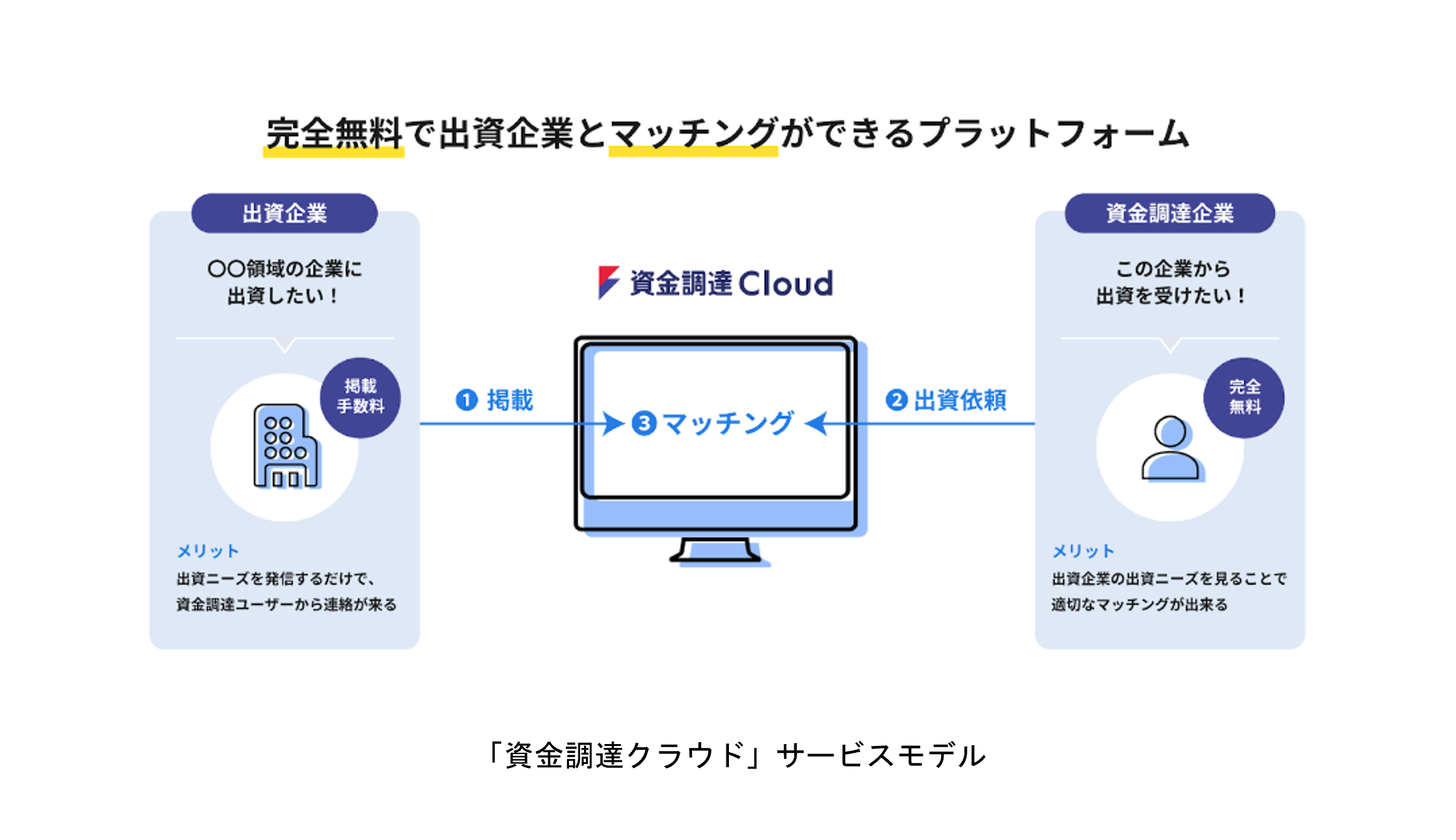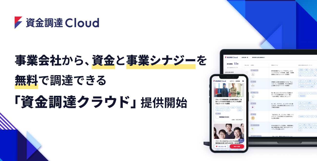 「資金調達クラウド」は、事業会社から資金とシナジーが調達できる新しいプラットフォームです。資金調達を検討している企業は、出資を検討している企業が掲載している会社情報、出資可能な金額・時期・ジャンルなどの情報を確認し、プラットフォーム上でダイレクトにメッセージを送ることができます。資金調達企業は手数料無料、スピード感のある資金調達が可能です。M&Aよりも幅広い条件でのマッチングを志向する傾向にある出資・資金調達ニーズに合わせた検索方法を採用し、会員登録情報を簡単にするなど、UXも最適化しています。このサービスにより、これまで実現しづらかった事業会社とスタートアップの新しいマッチングを創出します。