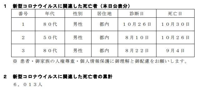 新型コロナウイルスに関連した患者の死亡について business Twitter Facebook はてブ Pocket LINE コピー 2022.11.01 この記事は約1分で読めます。 都内で新型コロナウイルスに感染した方が死亡されましたのでお知らせします。 お亡くなりになった方のご冥福をお祈り申し上げます。