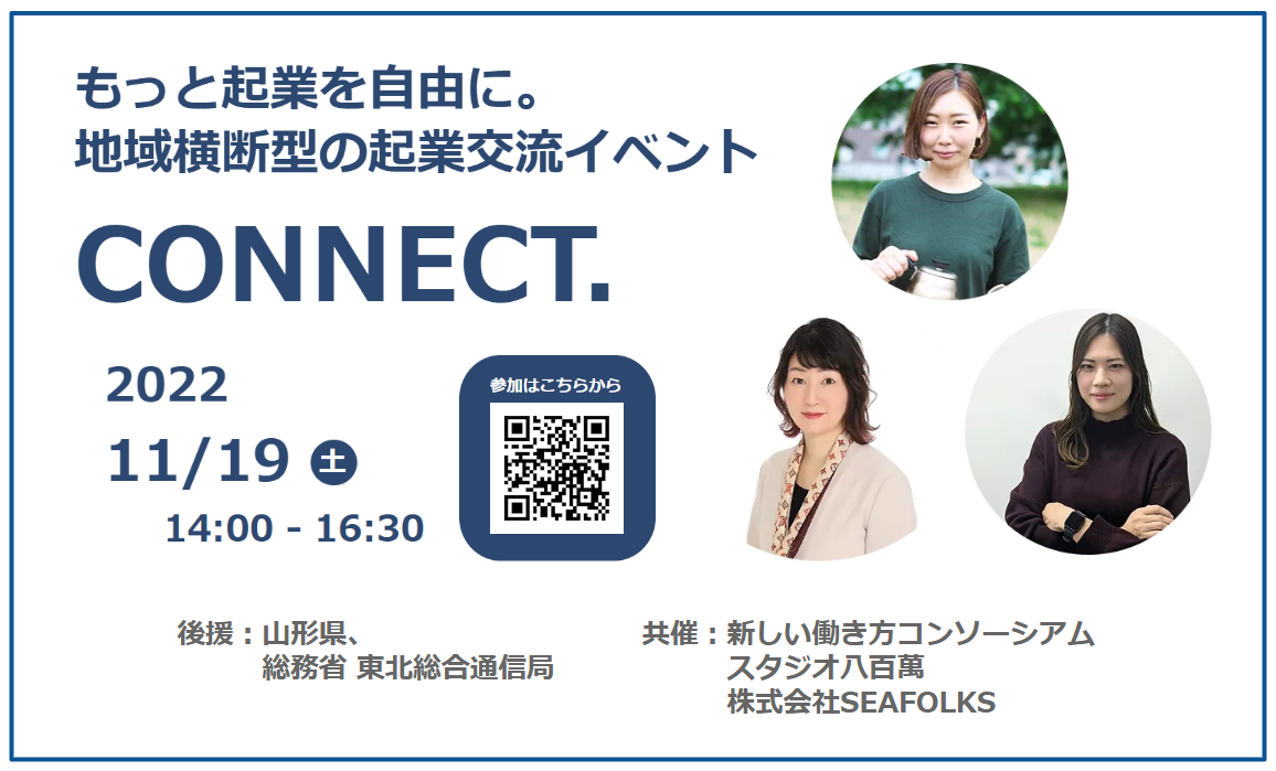 イベントの共催団体である新しい働き方コンソーシアムは、山形県産業労働部(中小企業振興課)より受託した「山形県コワーキングスペースネットワーク事業」の活動を行っている任意団体で、本事業はコワーキングスペース相互を常時ビデオ映像で中継し、山形県内のコワーキングスペースをオンラインネットワーク化することで会員の交流やチームビルディングを促し、一層の活性化を図る活動をしている。 これまでの交流活動(自主交流事業)では、各事業に対し延べ約 1,000 人が参加し、スタジオ八百萬を中心に、コワーキングスペース間の交流は大きく進展。また、フリーワーカーを養成するスキルアップ講座では、起業に結び付けるなどの成果をあげており、今回のイベント『CONNECT.』も、起業志望者たちが、ロールモデルとなる先輩起業家たちと交流できる機会を創出することで、より起業を身近に感じてもらい、新たな起業家の輩出の一助となることを目的とし開催される。