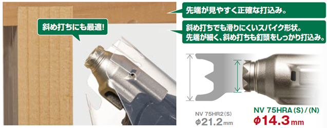 当社NV 90HR2他ですでに高評価をいただいているスリムな先端形状のスマートノーズを採用したことで、先端が見えやすく正確な打込みが可能です。また、斜め打ちでも滑りにくいスパイク形状なので、斜め打ち時でも釘頭をしっかりと打込めます。
