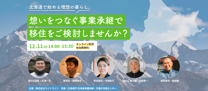 イベントでは北海道へ移住し温泉旅館を事業承継をされた方をお迎えし、移住と事業承継のリアルなご経験談をお伺いします。さらに、現在後継者を募集されている事業者さんにもご登場いただきます。どんな事業を営まれているのかや求めている人材像なども具体的にお話しいただきます!