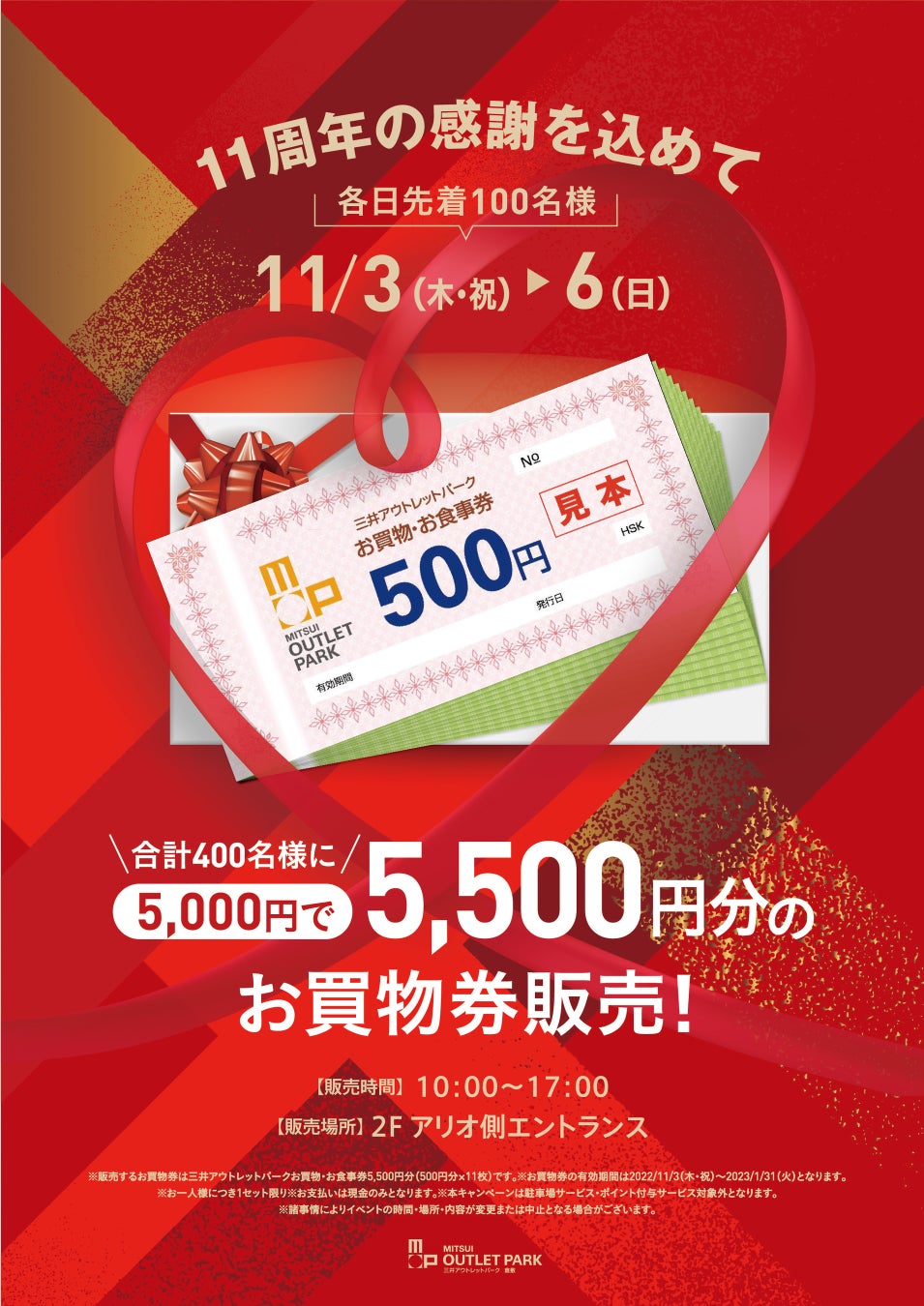 11周年の感謝を込めて、5,500円分の三井アウトレットパーク共通お買物・お食事券を5,000円で販売いたします。
