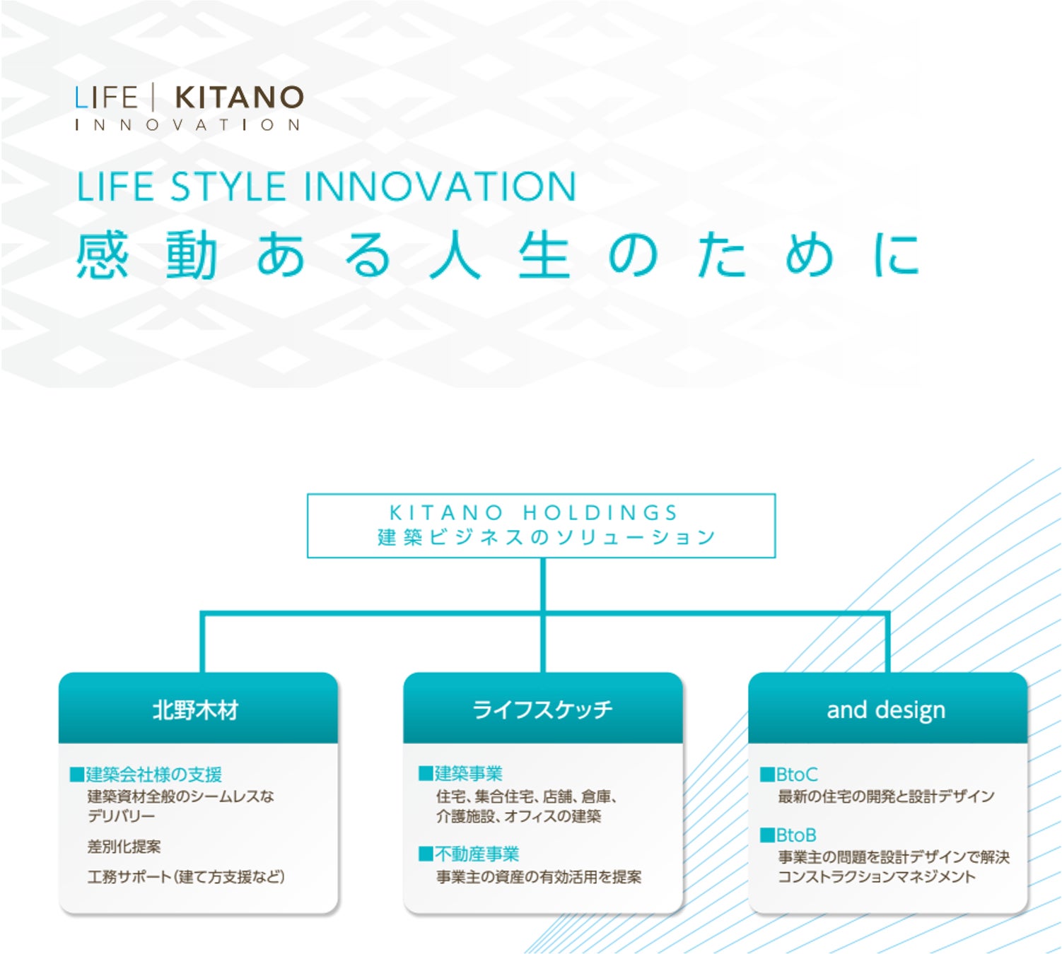 北野木材株式会社は1928年に創業し、今年で94年目を迎えました。建築建材、住宅設備の卸売を主な事業とし、大手ハウスビルダーや地域の工務店様に、時流やトレンドに沿った商品の提案をしてきました。子会社の株式会社ライフスケッチは注文住宅をメインに、集合住宅・店舗・介護施設・オフィスなどの建築事業をはじめ、不動産事業では事業主様に資産有効活用を提案するなど、お客様のご要望にお応えし、実現することで事業を拡大してきました。前年度のグループ全体の売上は過去最高額と、老舗ながら成長を続けております。コロナ禍を境にオンライン上のビジネスが加速する中、我々、建築・商空間業界以外でも多くの企業が事業推進に課題を感じています。そこで弊社は、 “木材業”から“建材・設備問屋業”へ、その後、“工務店事業”から“設計デザイン事業”へ業態を進化させ、常にお客様にご満足いただけるサービスを提供してまいりました。また、地域社会に貢献できる企業を目指すと共に、グループ間のシナジーを高め、より最適化した顧客課題への解決策をスピード感をもって開発・提供すべく、ホールディングス化に至りました。「変えてはいけない想い」を大切にしつつ、「大きく変わりゆく時代」へ対応するため、経営理念の主題である「LlFE STYLE INNOVATION 感動ある人生のために」をこれからも貫き続け、お客様そして地域社会へ貢献できればと考えております。