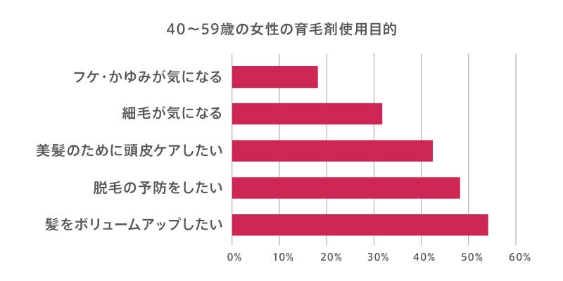 そこで、アンファーは20~59歳女性の育毛剤に対するアンケート調査を実施※3いたしました。その結果、20~39歳女性が育毛剤を使用する目的は「美髪のために頭皮ケアしたい」という回答が最も多く、42%を占めました。次点は「脱毛の予防をしたい」が39%を占め、「薄毛になってから育毛剤を使用する」という一般的なイメージとは異なり、若年層は「育毛剤で髪や頭皮をケアしたい」という予防ニーズがあることが推測できます。