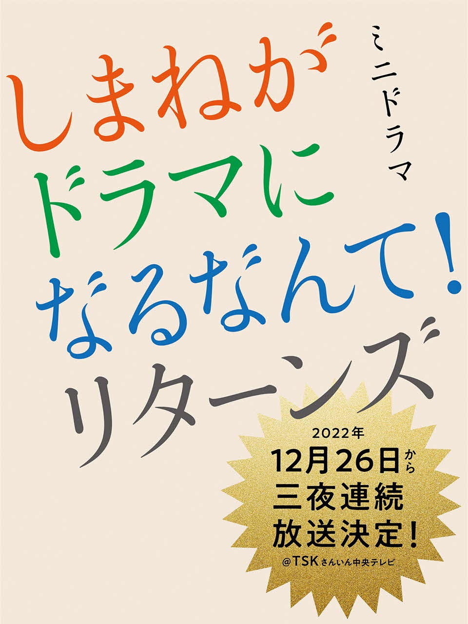 また、ドラマ続編「しまねがドラマになるなんて!リターンズ」を12 月26日(月)から3夜連続で放送することが決定しましたので、お知らせします。