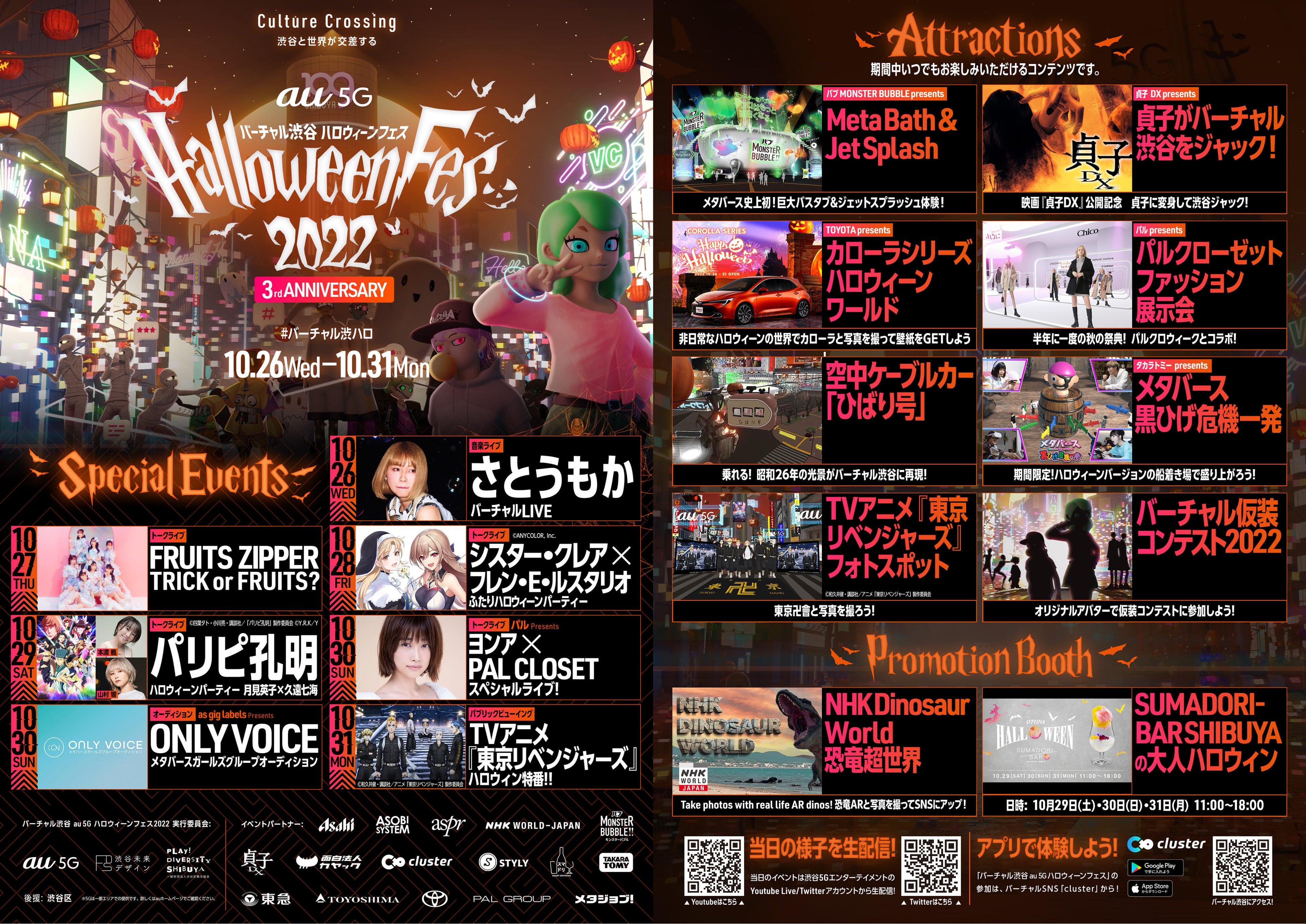 バーチャル渋谷ハロウィーン実行委員会(KDDI株式会社、一般社団法人渋谷未来デザイン、一般財団法人渋谷区観光協会)は、「バーチャル渋谷 au 5G ハロウィーンフェス 2022」(以下、バーチャルハロウィーン)を、渋谷区公認配信プラットフォーム「バーチャル渋谷」内で、10月26日(水)から31日(月)まで開催しました。3年目の開催となる今年は、「Culture Crossing – 渋谷と世界が交差する -」というテーマを掲げ、賛同したパートナー16社と共に、日本のポップカルチャーとテクノロジーを融合させた新たなエンターテイメントを渋谷から世界へ発信しました。