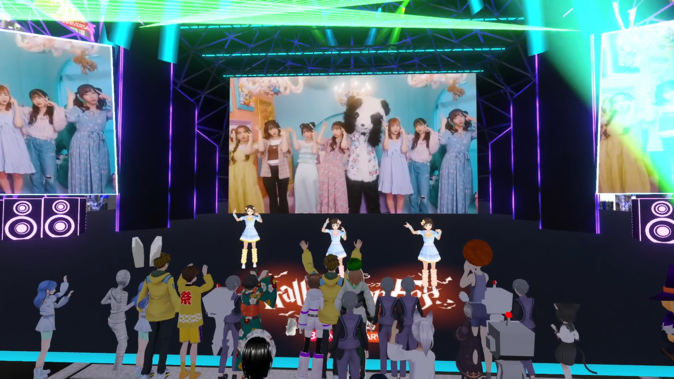 7人組アイドルFRUITS ZIPPERから月足天音さん、鎮西寿々歌さん、早瀬ノエルさんの3人が「バーチャル渋谷」に初登場。アバターで降り立った3人は、渋谷の街を自由奔放に散策。海外から参加しているファンからも遠い国から参加できることへの喜びのコメントがよせられました。Q&Aのコーナーでは「ハロウィーンで仮装するならこのメンバーにこの仮装をしてほしいというものはありますか?」の質問には寿々歌さんに対し、「幼稚園児の恰好をしてほしい」といった願望や、それぞれに似合いそうな仮装をコメント。最後は集まったファンたちと集合写真や代表曲でもある『わたしの一番かわいいところ』で一緒にダンスを踊り、会場が一体感に包まれました。
