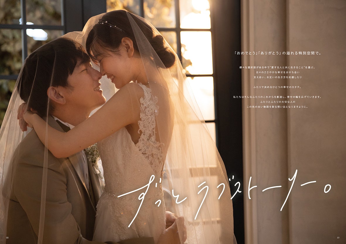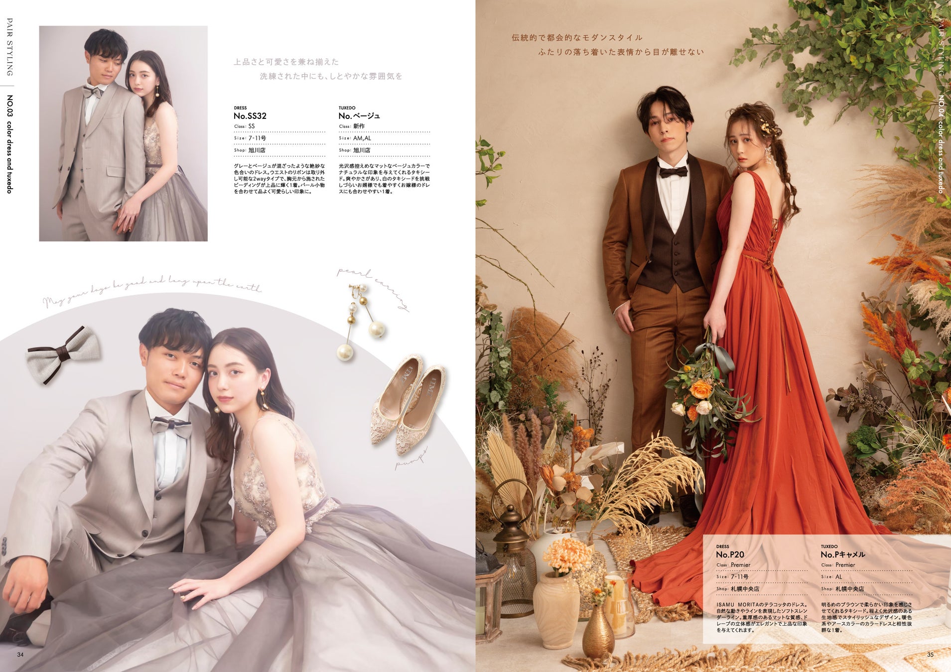 ペアスタイリング(コーディネート紹介)や小物紹介、お客様インタビューなどお嫁様だけではなくお婿様もふたりで「こういうのっていいな」と夢を描ける一冊となっています。
