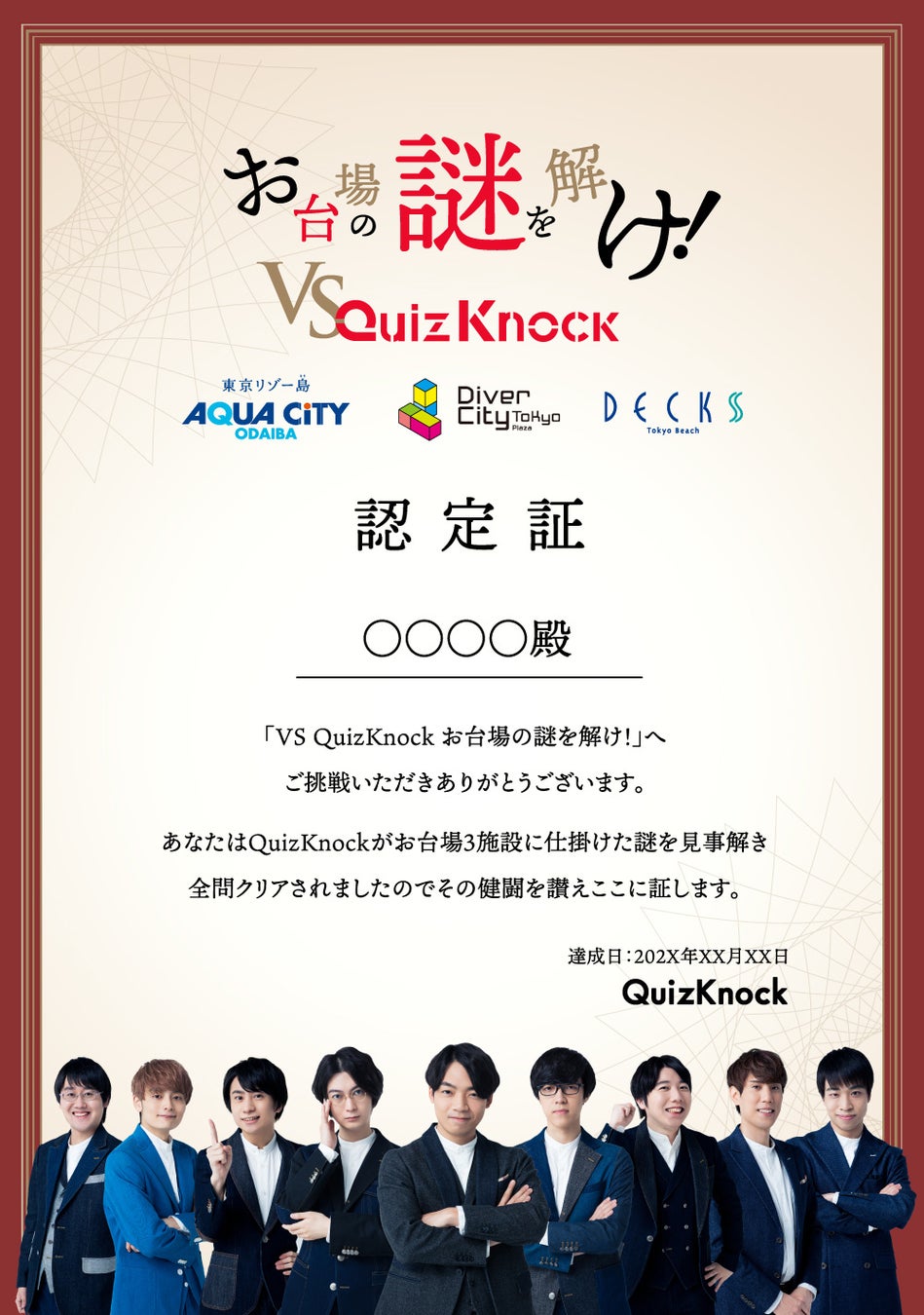 今年の4月に当館10周年「謎解きショッピング」でコラボした、クイズ王・伊沢拓司さん率いる東大発の知識集団QuizKnockが、今回はダイバーシティ東京 プラザ、アクアシティお台場、デックス東京ビーチの3施設を舞台とし、お台場をテーマに考案した謎解き、「お台場の謎を解け!VS QuizKnock」を期間限定で開催決定!スマホから気軽に参加可能な謎解き企画になっています。それぞれに仕掛けられた謎を解くと認定証を獲得できます。
