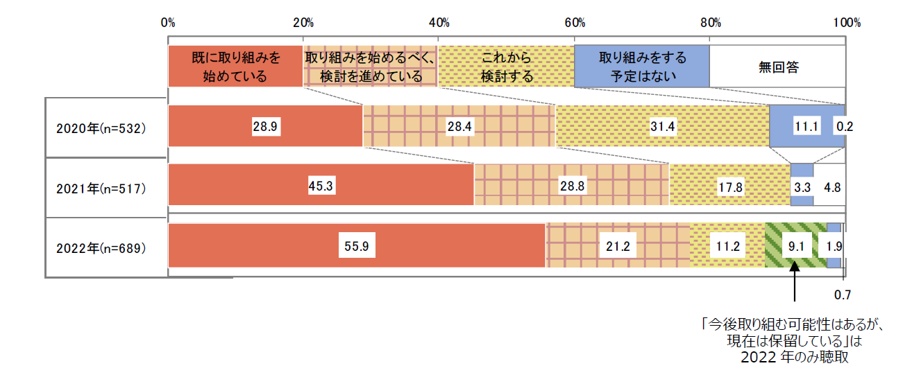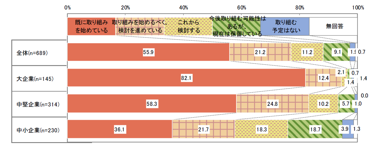 ○ 従業員規模別に見ると、取り組みを始めている企業が、大企業では8割超と高めになっているほか、中堅企業でも58.3%と半数を超えています。中小企業では取り組みを始めている企業は36.1%にとどまりますが、「検討を進めている」「これから検討する」も合算すると76.1%となり、関心の高さがうかがえます。【図1-2】